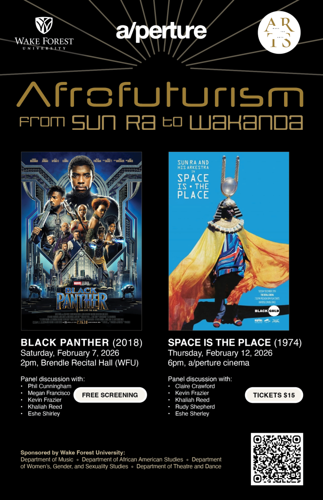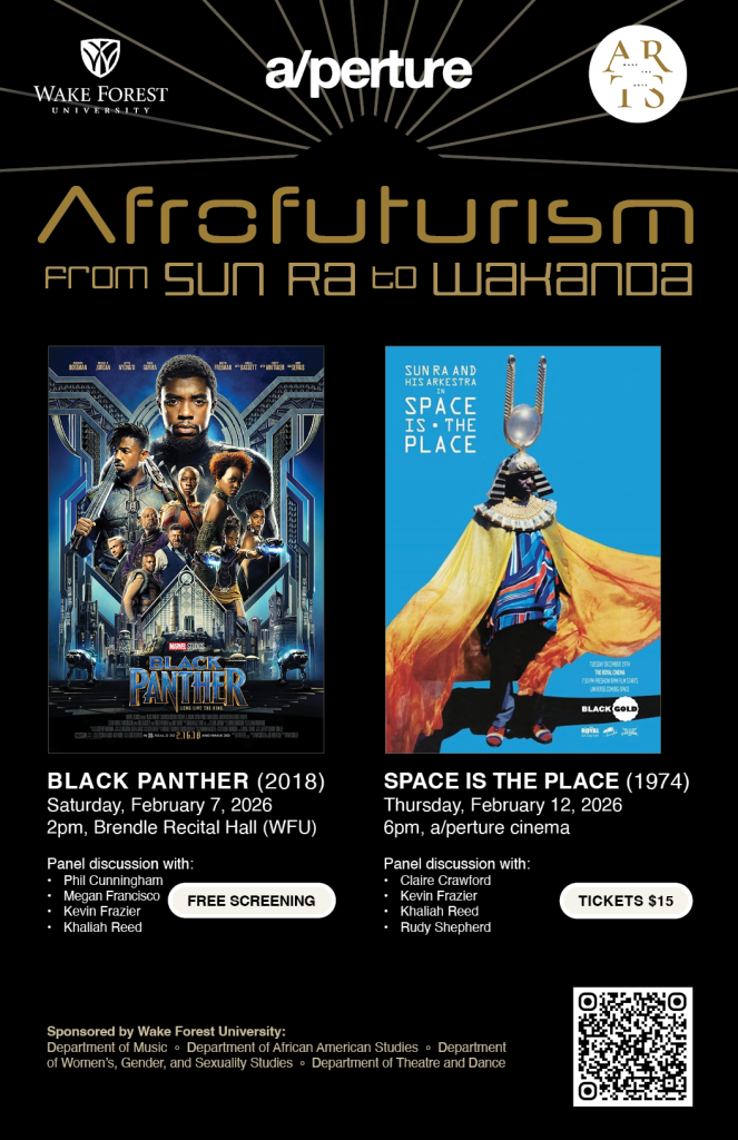 “Afrofuturism: From Sun Ra to Wakanda” is a two-part film series exploring the influential genre through screenings and panel discussions of Space is the Place (1974) and Black Panther (2018). This collaboration between a/perture cinema and Wake Forest University will bridge academic and community audiences to illuminate the enduring power and cultural significance of Afrofuturism. We invite you to engage in conversations that connect these two landmark films, showcasing the movement’s evolution and its ongoing relevance in arts, culture, and society. All are welcome.