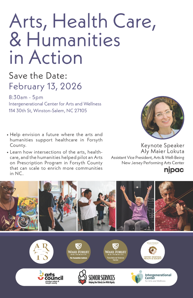 We will hear about findings from the pilot study and will also learn about the Arts Rx Program at the New Jersey Performing Arts Center that inspired the project. Our discussions will also highlight the programs of several organizations on campuses and in communities working at the intersections of the arts, research, health care, human services and the humanities that could help grow and support the Arts Rx Program and others like it in NC and beyond, through collaborative Wake Forest and various community partnered teams.