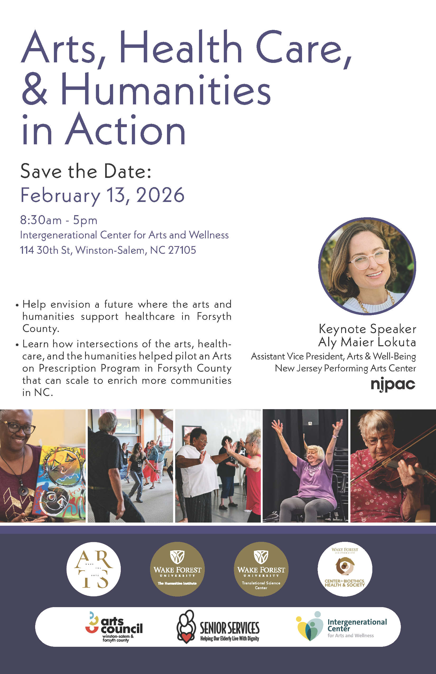 The catalyst for this conversation is the Winston-Salem Arts Council-funded Arts on Prescription pilot study, an innovative project that brings together leadership from the Intergenerational Center for Arts and Wellness at Senior Services, Inc., staff from the Winston-Salem Arts Council, faculty and staff from Wake Forest University / Wake Forest University School of Medicine, and independent teaching artists to test an Arts on Prescription (Arts Rx) Program for older adults in Forsyth County.